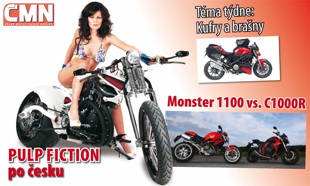 Po dlouhé době jsme zase dostali pěknou ženskou! Na titulní stranu samozřejmě. Je jí topmodelka Jana Doleželová, která svými půvaby přírodními zkrášlila půvaby ocelové, konkrétně na stroji Pulp Fiction.