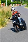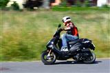 Elektrický startér nahazuje dvoutaktík celkem bez potíží, zvuk při startování spíš připomíná pouštění autíček po autodráze. Okamžitě však překvapí takové muší vibrace. Jelikož je zadní kolo společně s motorem uložené klasicky po skútrovsku hodně „gumově“, vibrace se do řídítek ani zbytku stroje nepřenáší skoro žádné. Jenom takové sotva patrné lechtání.