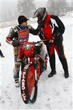 Ne z článků kolegy Ivo Helikara, ale až v depu jsem pochopil, jak to vlastně v současnosti s ledovou plochou dráhou u nás vypadá. Je to záležitost hrstky odvážných dobrodruhů, kteří startují na prapodivných strojích z velké části vlastní konstrukce. Stáří ani výkon motoru nerozhoduje. V Růžené bylo na některých jezdcích dokonce vidět, že jim o body vlastně až tak nejde a že se přijeli v první řadě svézt pro zábavu. Vítězí se srdcem a mírou důvěry v ledový podklad. Protože když na to „strejdové“ sedli a zatáhli za plyn, tak se mi najednou udělalo nějak sucho v hrdle. Z mého pohledu jeli strašnou pilu, motorka nalepená na motorce a v zatáčkách levý konec řídítka skoro zabořený do ledu. Jako smyslů zbavení! V tu chvíli jsem si taky všiml, jak to s nimi hází, a pochopil jsem, proč mají vpředu moderní ledařské speciály robustní a drahou USD vidlici. Tonda Klatovský se mě zeptal, co na to jako říkám a jestli mám strach. Přiznal jsem, že respekt mám obrovský a že mě fascinuje ta rychlost. On mi na to odpověděl jen. „Rychlost? Tak to jsi ještě neviděl mistrovství světa, panáčku! My tu s bráchou vyhráváme, ale přitom jedeme na třetinu toho, jak se jede svět!“ Pak jsem na hrázi potkal i výše zmiňované mistry Rozehnalovy. Slova „podpory“ Marka, který je zvyklý hazardovat se zdravím v sajdě celé léto, zněla asi takhle: „Ty na to chceš vážně vlézt, jo? Tak to jsi blázen nebo sebevrah! Já bych na to totiž nikdy nevlezl...“ Korunu tomu ještě nasadil jejich mechanik Pípa, který prohlásil:„Oni ti vážně pučej´, jo? Tak na tohle si teda rád počkám!“