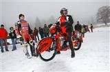 Letos to konečně klaplo a v sobotu 19. února jsme v sestavě David M. Bodlák – řidič a fotograf, Petr Pour – rezervní řidič, rezervní fotograf (podle zkušeností z Elefantů je dobré mít všechno rezervní) a já v roli figuranta vyrazili na závody MČR u obce Růžená u Milevska. Pro všechny to bylo první blízké setkání s ledovou plochou dráhou. Mě osobně nadchla atmosféra. V Růžené jsme si konečně zase užili to, co většina velkých letních závodů nenabízí. Jakoby se tam krásně zastavil čas. Pořadatelská služba složená z místních hasičů a myslivců, parkování na poli, místo tribun hráz, místo tratě a mantinelů jen zamrzlý rybník s vyhrabaným oválem, jehož okraje byly vyznačeny v duchu tradic větvičkami nějakého jehličnanu. Opodál pár pártystanů, které tvořily depo. A samozřejmě nezbytné klobásy, grog a vlezlá zima. Na první pohled bylo jasné, že jestli lze nějaký motoristický sport nazývat jako okrajový, do kterého se nikdo moc nehrne, tak je to právě tento. Na druhou stranu podívaná to byla famózní a na příští zimu všem motorkářům vřele doporučuji sledovat kalendář a udělat si výlet. Je to jedna z možností, jak se spolehlivě dostat ze zimní depky. To mi věřte!