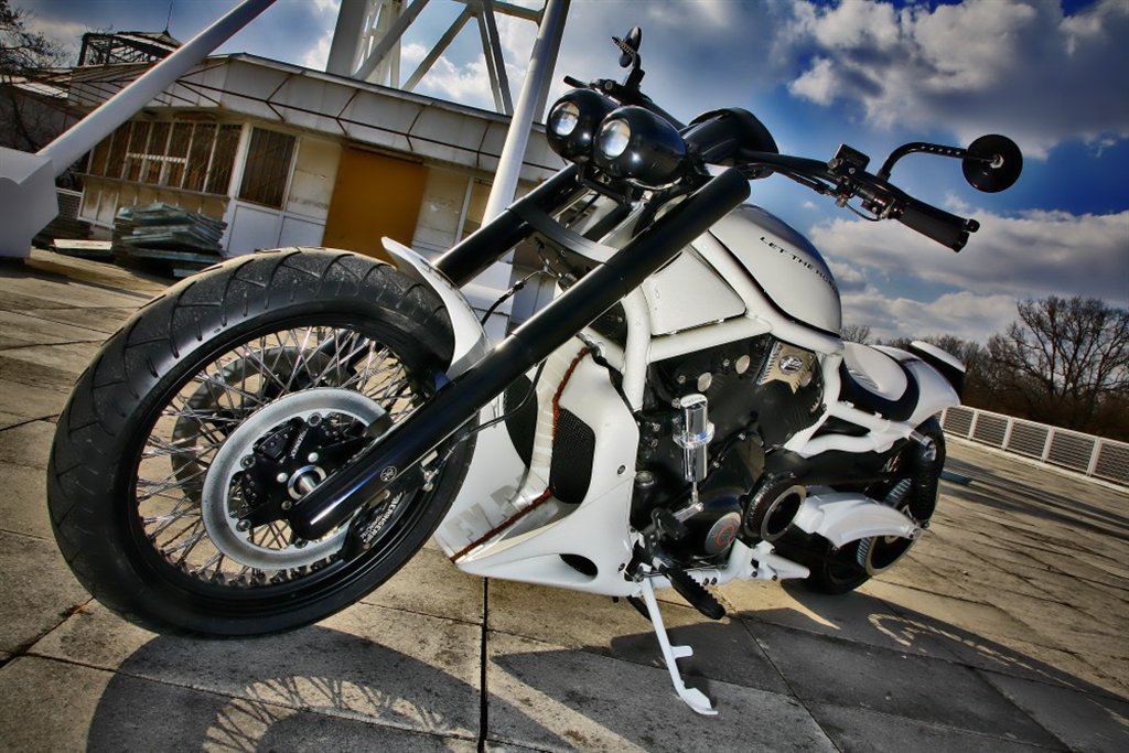 Název chopper vznikl od slovesa „chop“, tedy něco osekat, ořezat, zkrátit, zjednodušit. Pokud bych to měl brát doslova, pak je samorost Laďa, majitel tohohle biku, typickým čoprákem. Nikdy však nejezdil s dlouhou vidlicí zavěšený na extrémně vysokých řídítkách. Laďa vyrostl na enduru, motokrosu, motardech a závodech horských kol. V-Rod byl jeho první „silniční“ motorkou, ale ze začátku se k němu choval stejně jako k té motokrosce. Dokonce hůř než jen „uživatelsky“. Z motorky postupně posundával všechny zbytečné díly a co nešlo sundat, to uřezal. Stejně jako ořezal a zjednodušil zbylé funkční díly. „A hlavně tam napiš, že uřezal i výfuky! Ne jen kousek, ale postupně je zkracoval, až vlastně zůstaly jen svody. Nemyslím výfuky originální, ale celkem drahé závodní Kerkery! No teda řvalo to nelidsky… A protože uřezal prakticky celou zadní partii, neměl kam dát espézetku, tak ji vozil v batohu. Když jsem se ho ptal, jestli mu to jako nevadí, že to tak příšerně burácí, odpověděl mi jen, že mu to nepřijde hlasitý,“ vzpomíná na první zážitky s Laďou Jakub Petr z Pro Performu.
